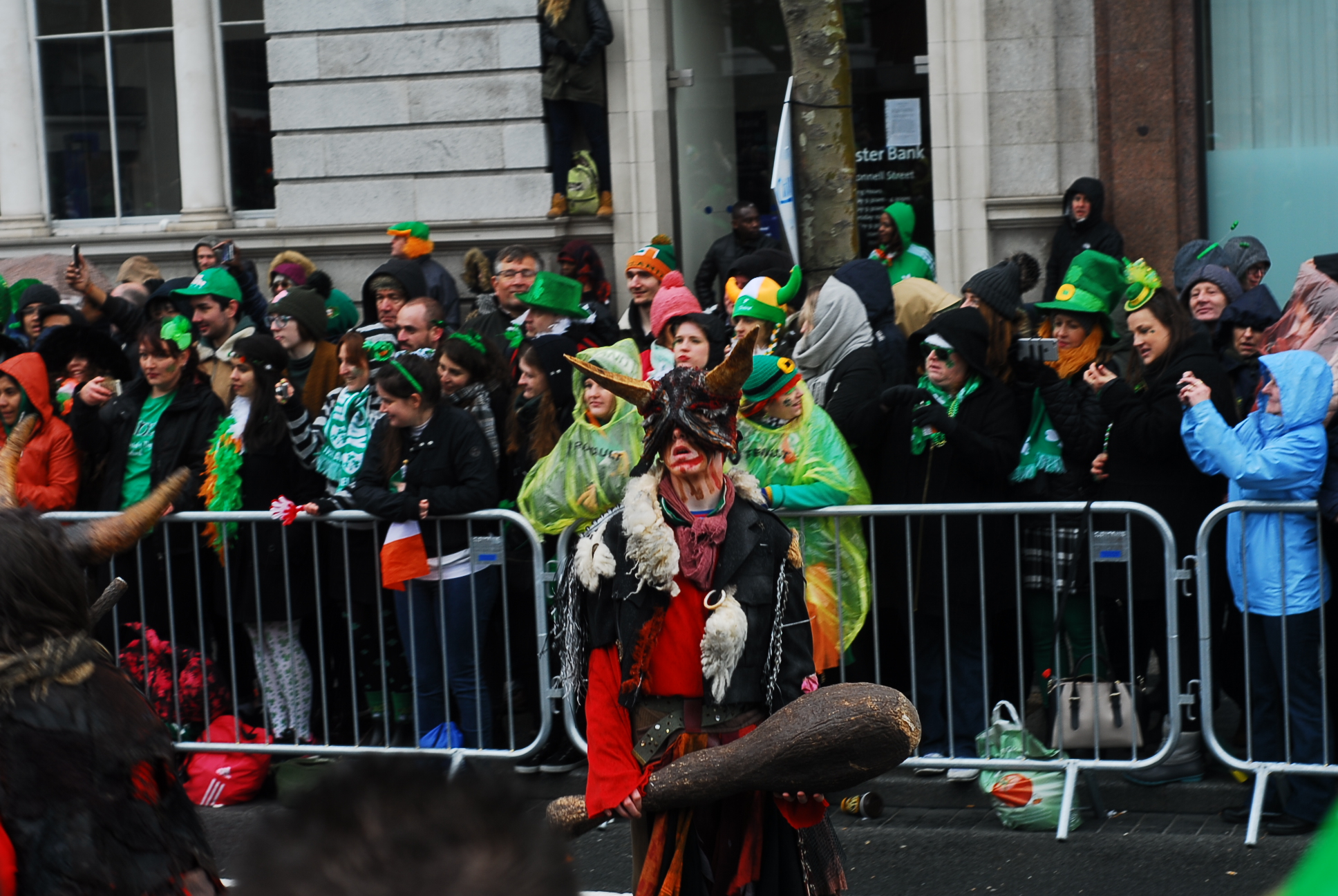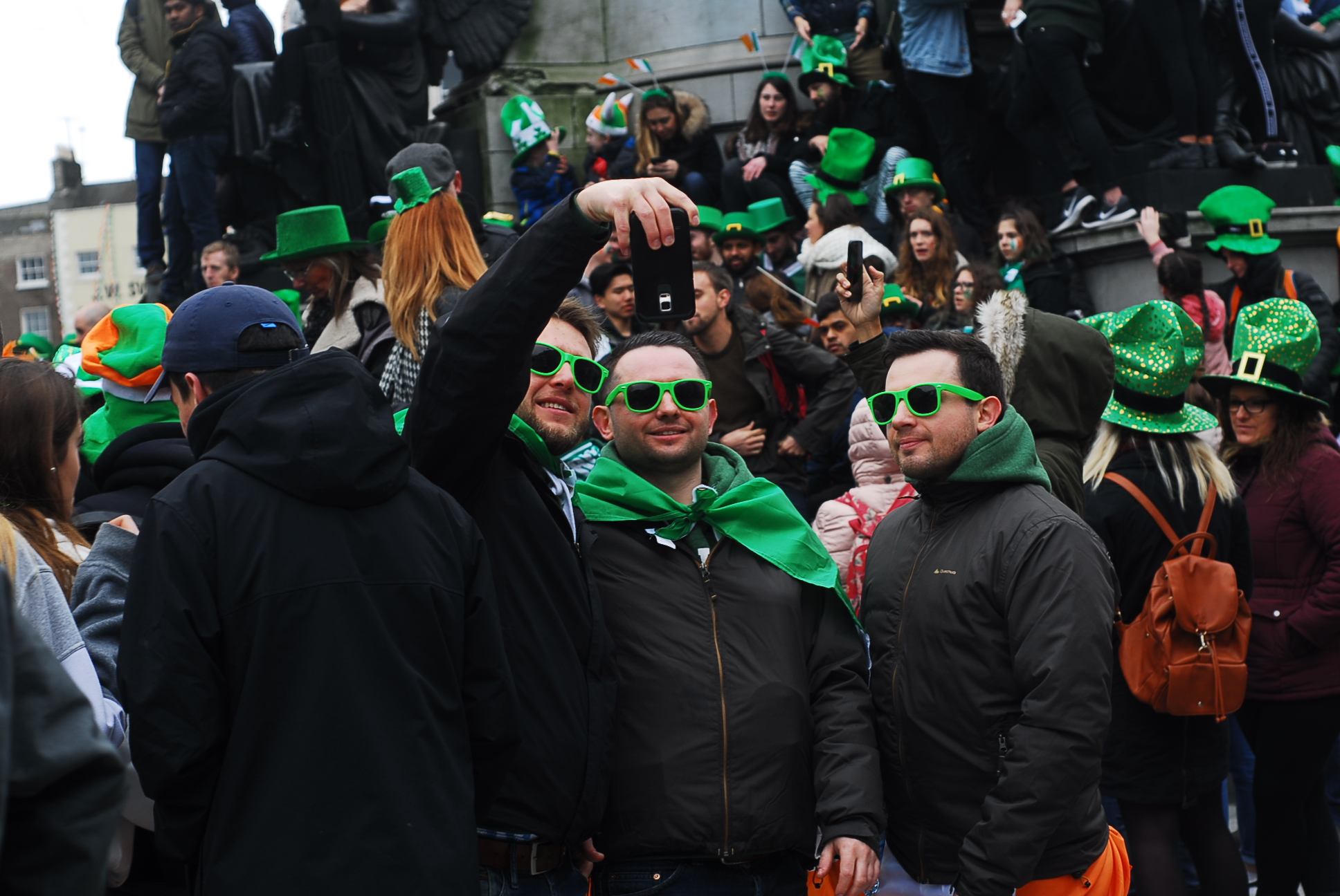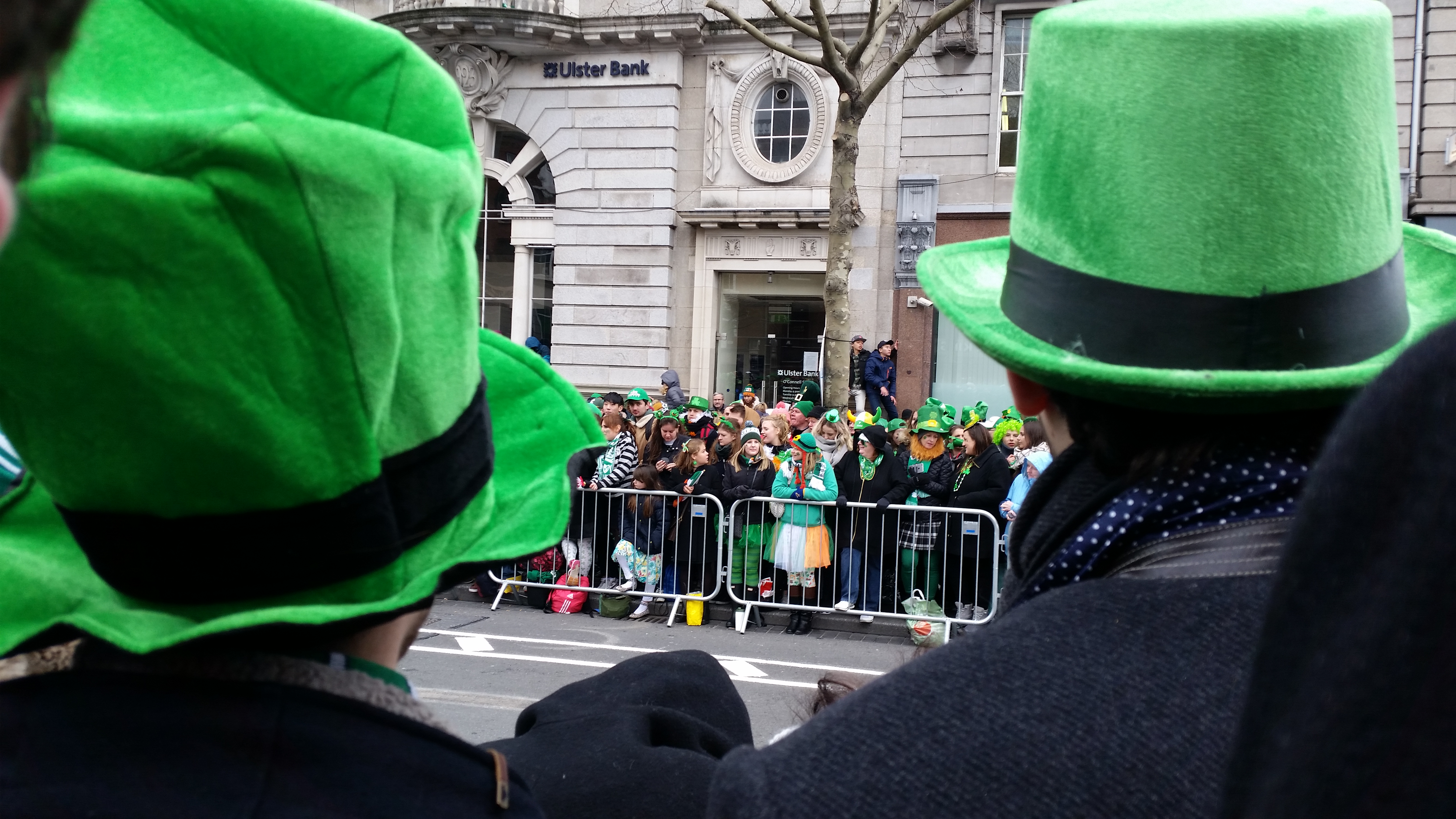 Niestety to niezbyt dobry pomysł, by 500 tys osób stało wzdłuż jednej ulicy, bez schodów, podwyższenie i innych udogodnień pozwalających zobaczyć coś więcej niż zielone kapelusze stojących przed nami przebierańców. Nam udało się wspiąć na pomnik i z jego stopni zobaczyć paradę.