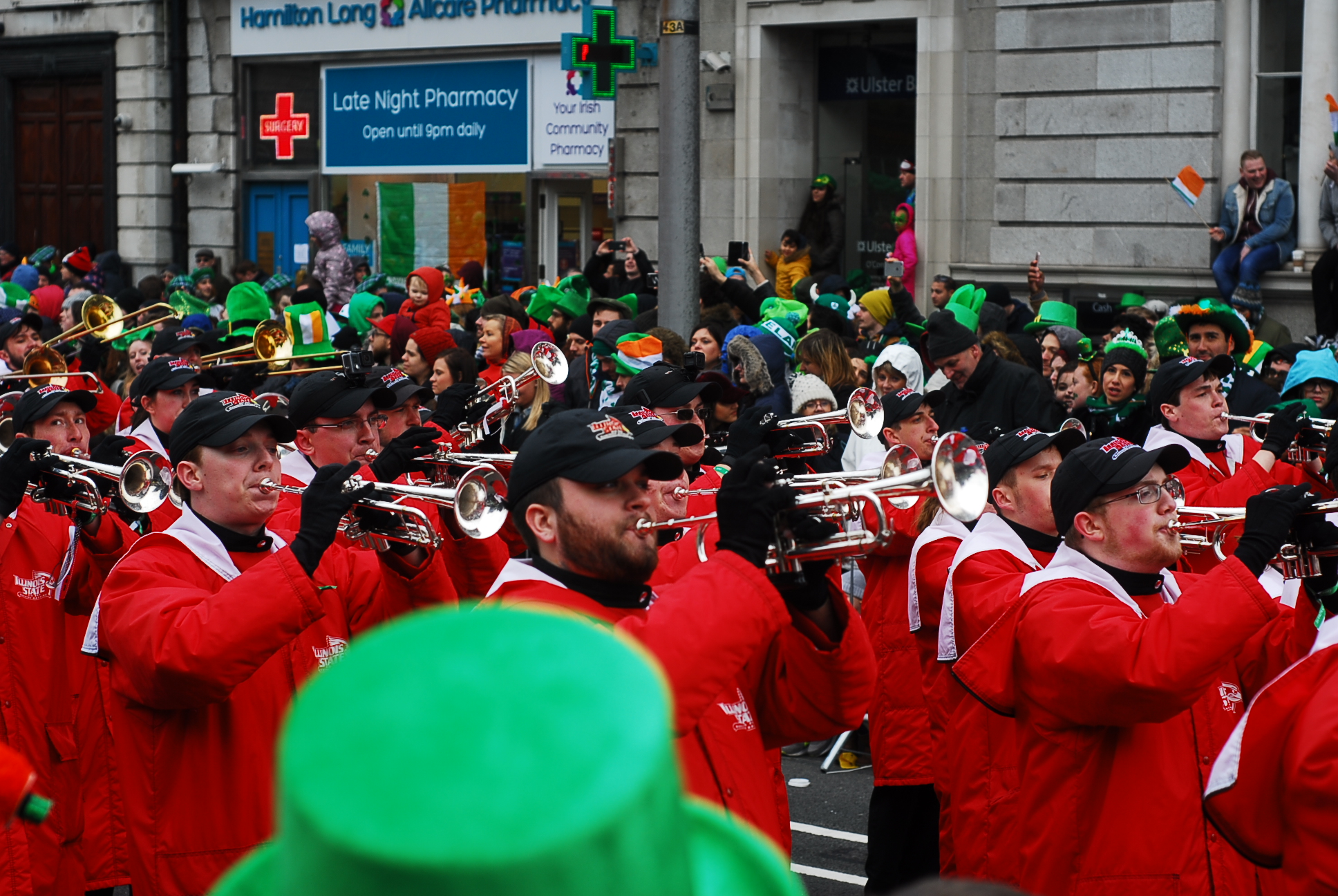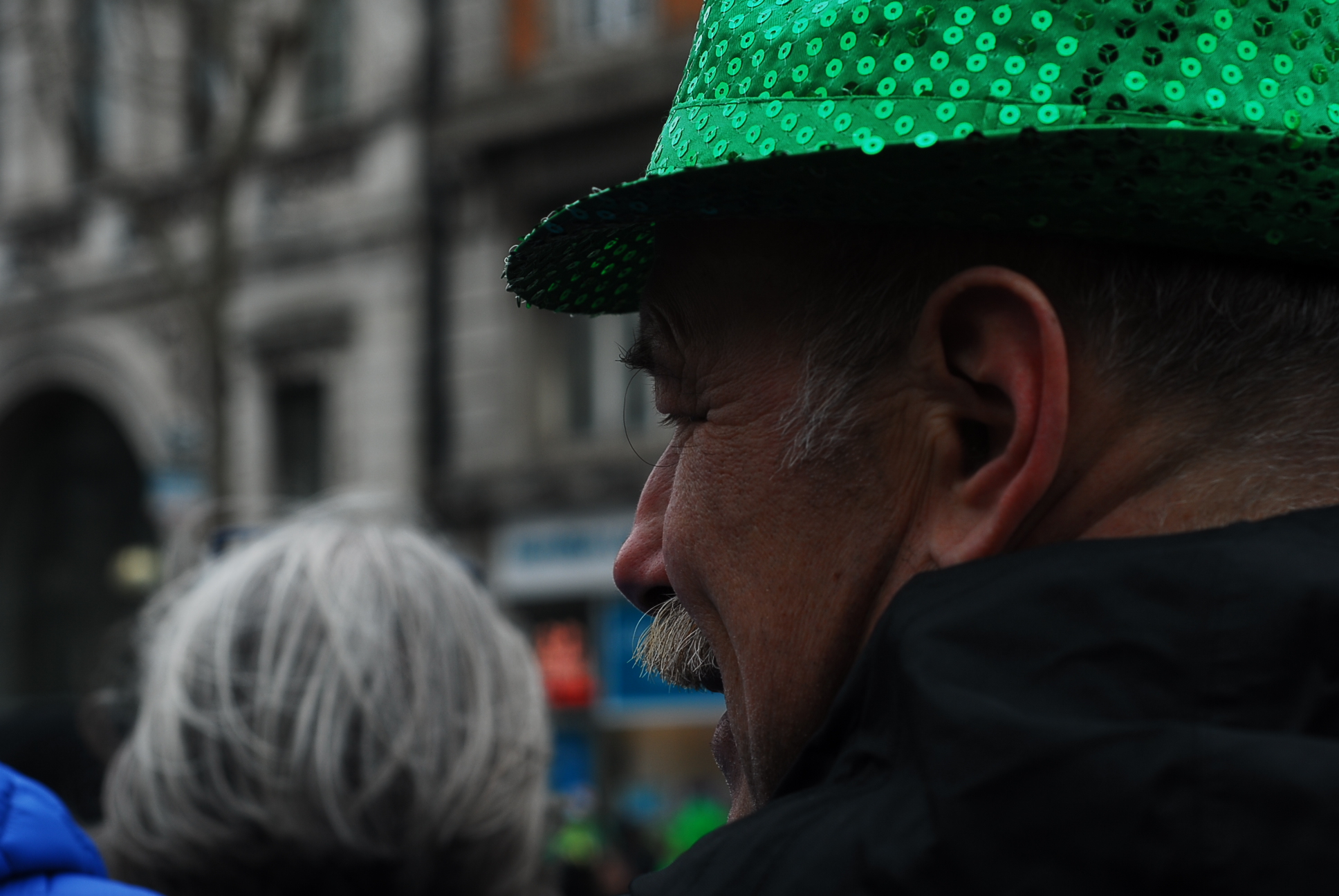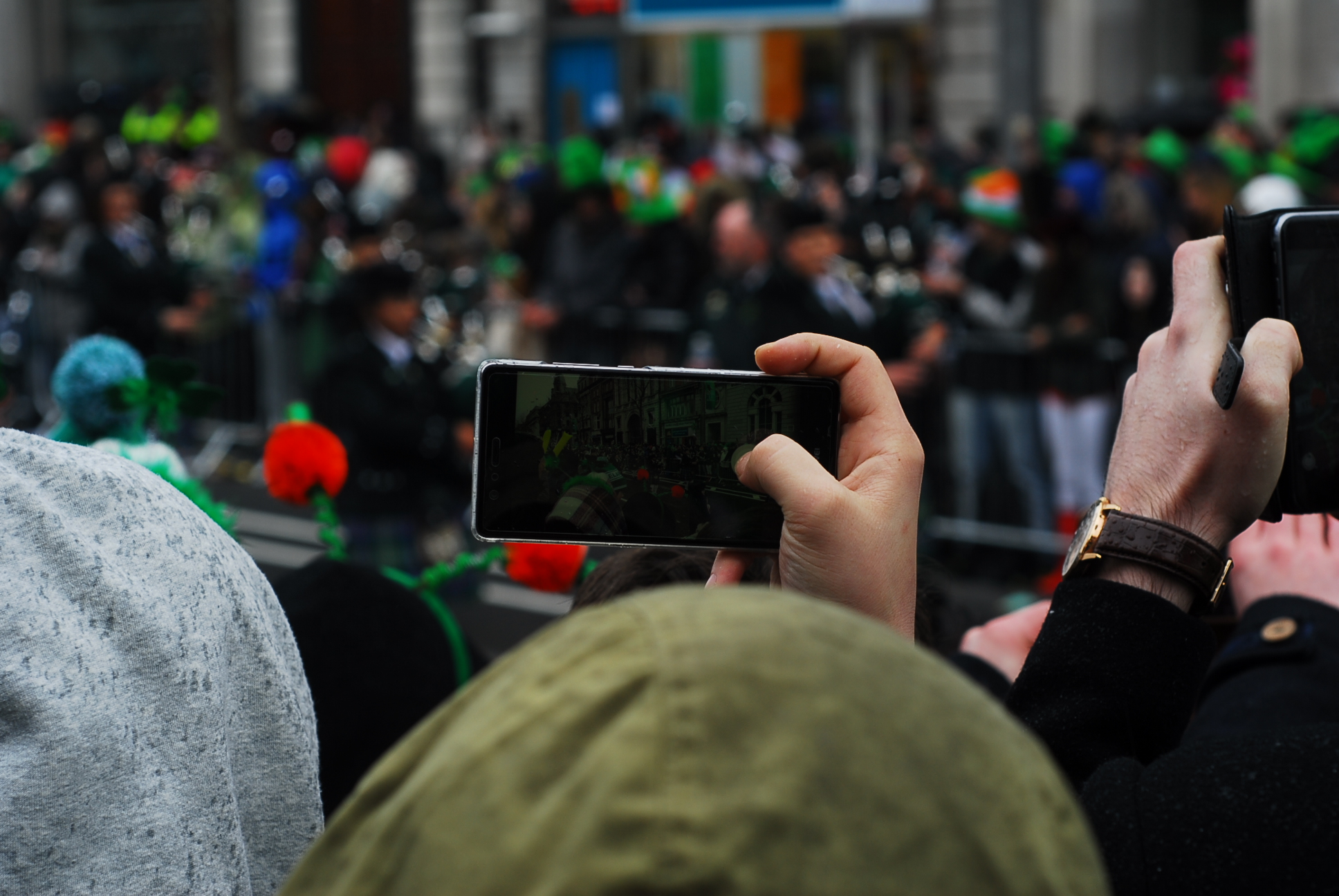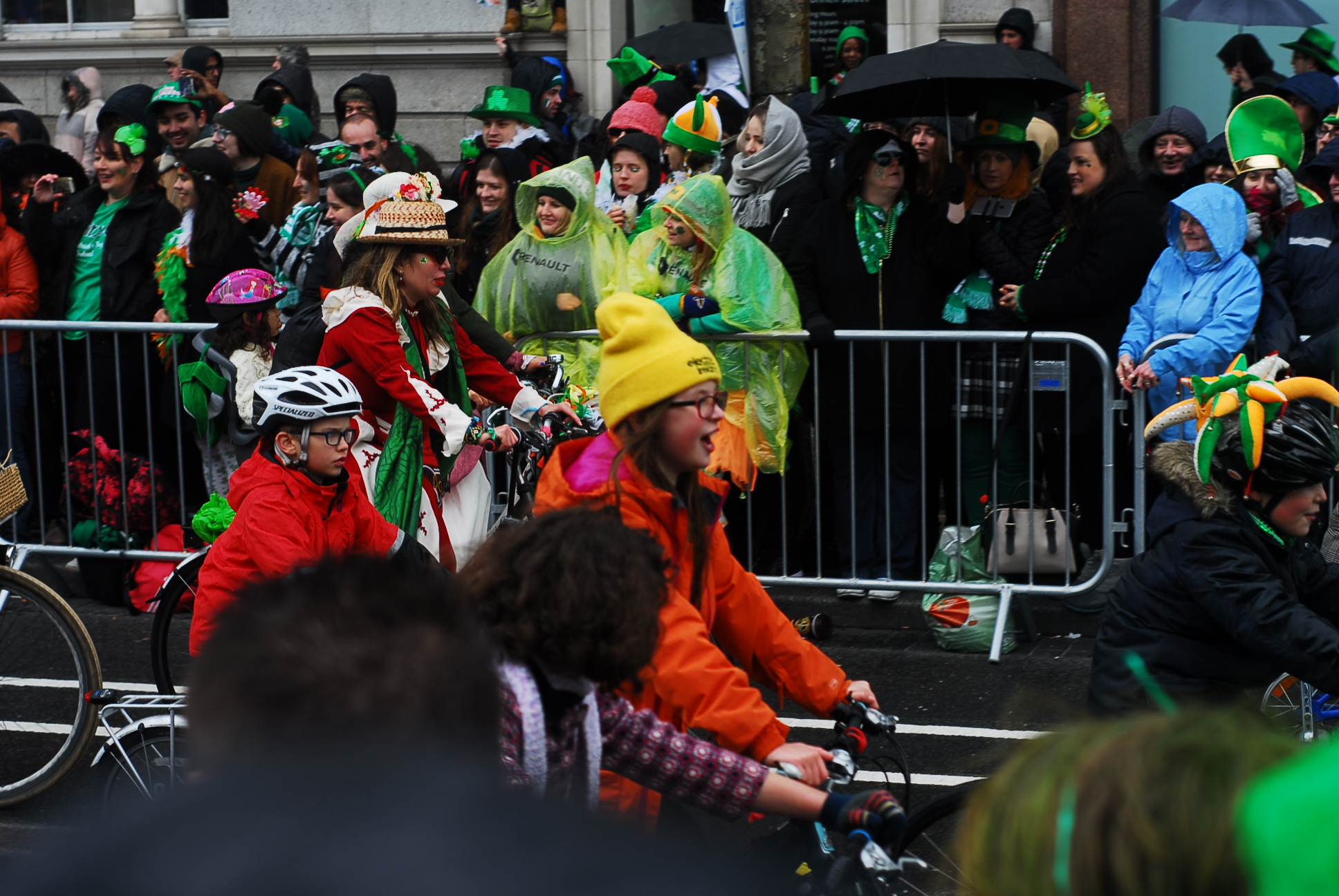 Niestety to niezbyt dobry pomysł, by 500 tys osób stało wzdłuż jednej ulicy, bez schodów, podwyższenie i innych udogodnień pozwalających zobaczyć coś więcej niż zielone kapelusze stojących przed nami przebierańców. Nam udało się wspiąć na pomnik i z jego stopni zobaczyć paradę.