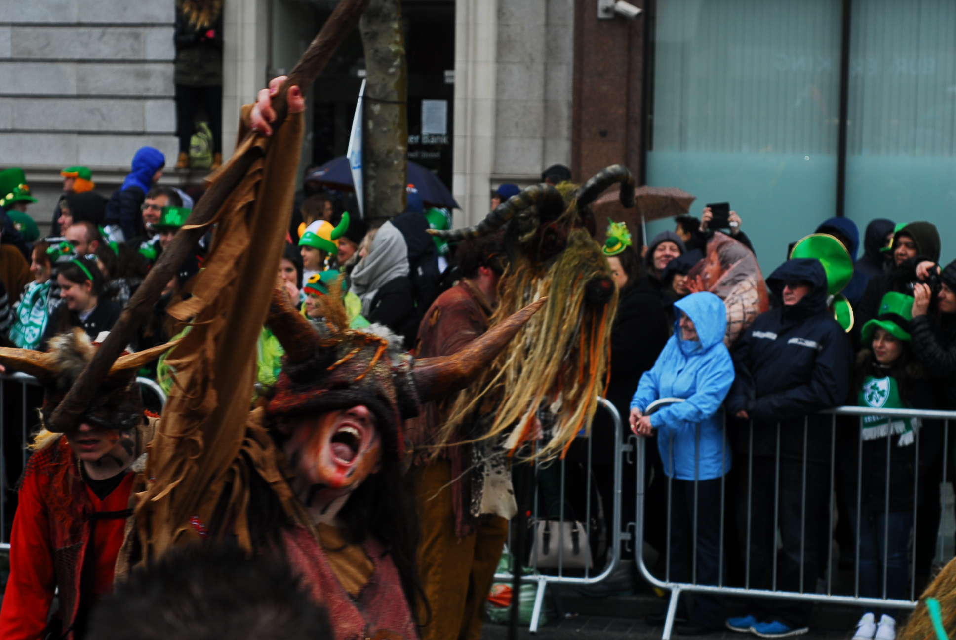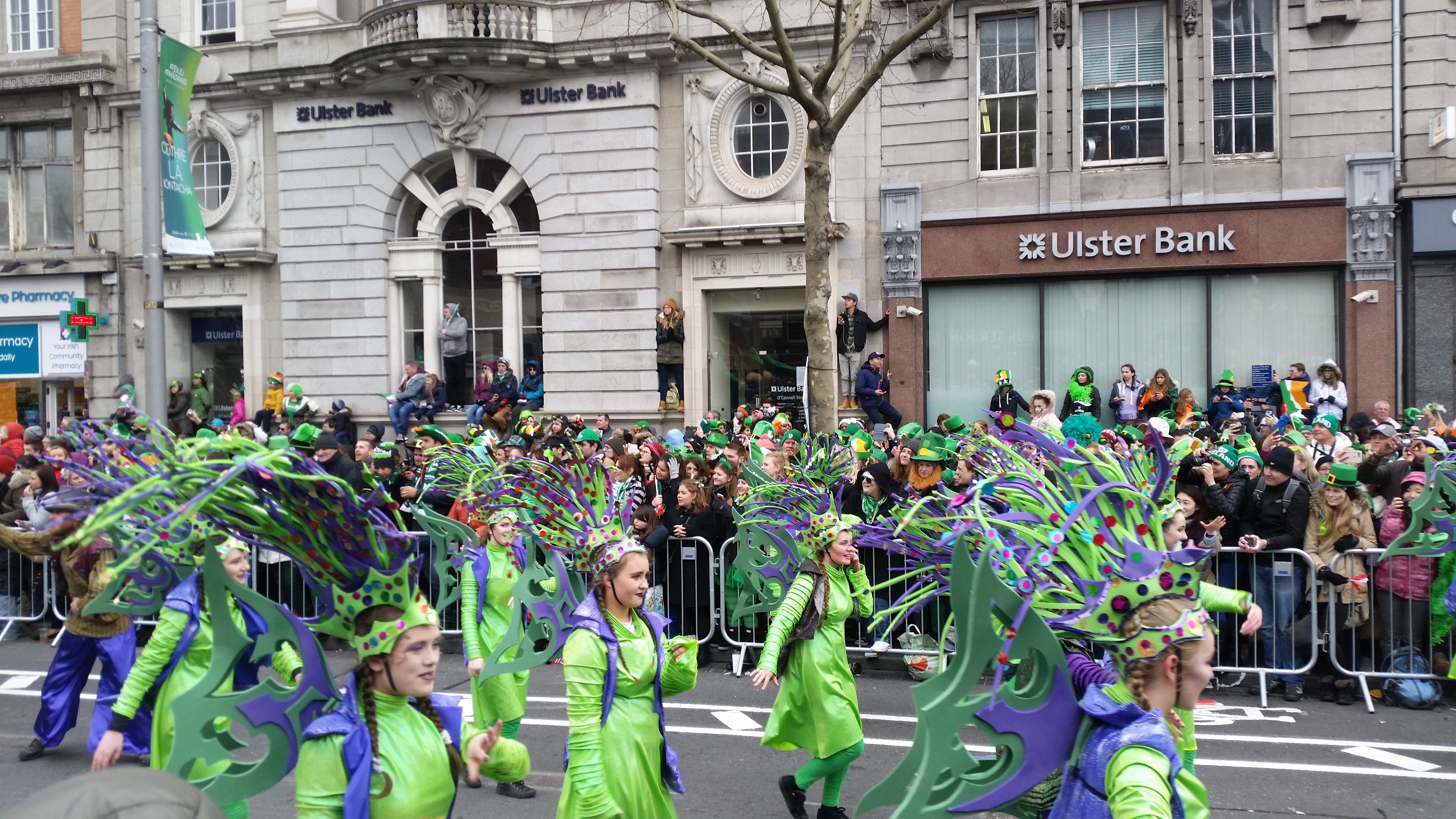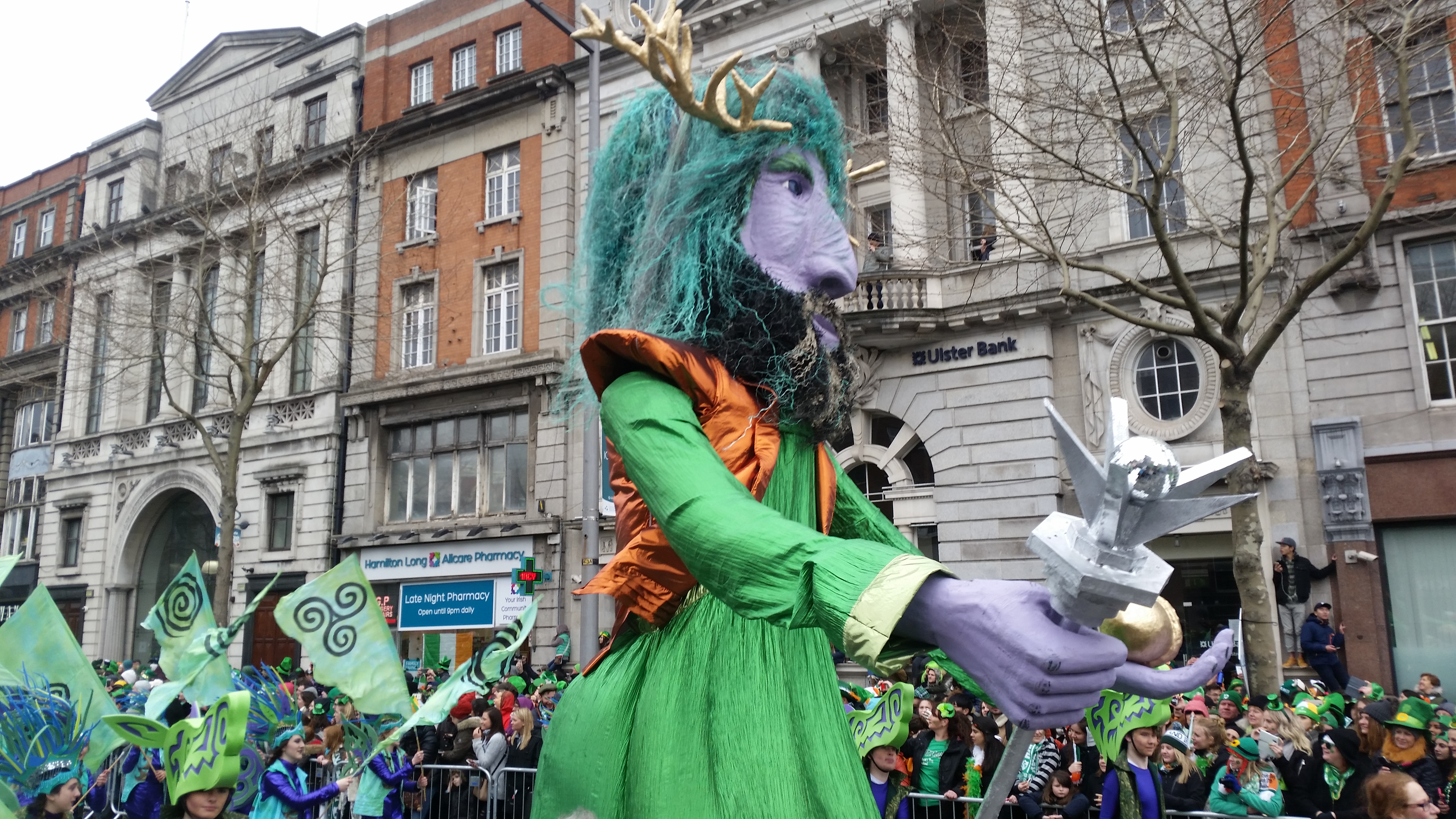Zanim zdecydowaliśmy sie przyjechać do Irlandii, dużo czytaliśmy i szperaliśmy w internecie na jej temat. Wyobrażałam sobie genialna paradę, wielkie uliczne show, przynajmniej na skale Fallas w Walencji (link). Stąd podekscytowanie i radość. Byłam pewna, że kolorowy korowód będzie śnił mi się po nocach, a całość przyćmi Chiński Nowy Rok świętowany w Londynie, a moze nawet karnawał w Wenencji? Rzeczywistosc jest jednak bardziej prozaiczna. 17 marca to w Irlandii dzień wolny. Irlandczycy w większości zostają w domach i oglądają paradę w telewizji, bądź uczestniczą w tej organizowanej w ich miastach, od po południa zasiadają w pubach i świętują z bliskimi. Młodzież jedzie do Dublina, lecz nie na paradę a by zająć jak najwcześniej miejsce w pubach na Tample Bar. Które zaraz po skończeniu występów będą przepełnione aż po brzegi. Dla kogo więc ta parada? W większości dla turystów, którzy ściągają tłumnie do miasta, ubierają się w zielone boa, kapelusze troli i rude brody i obserwują paradę.
