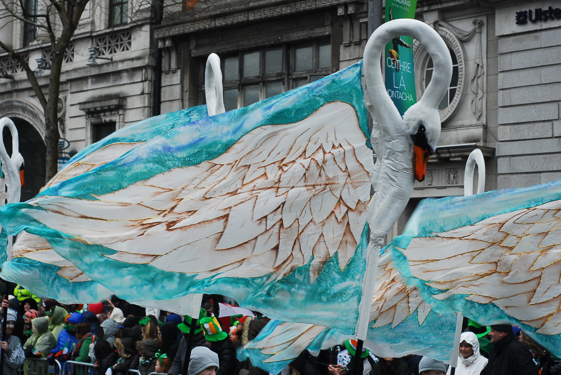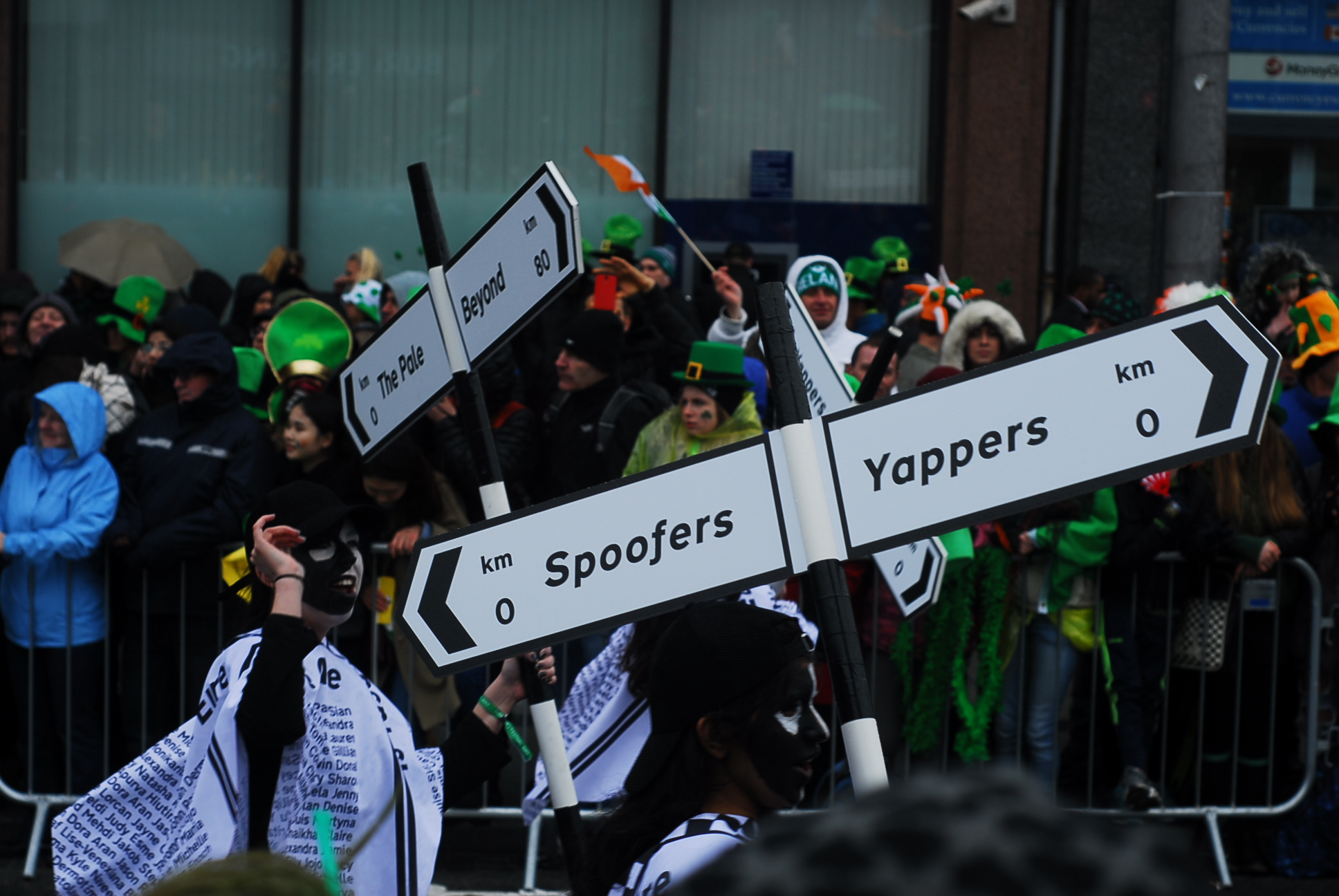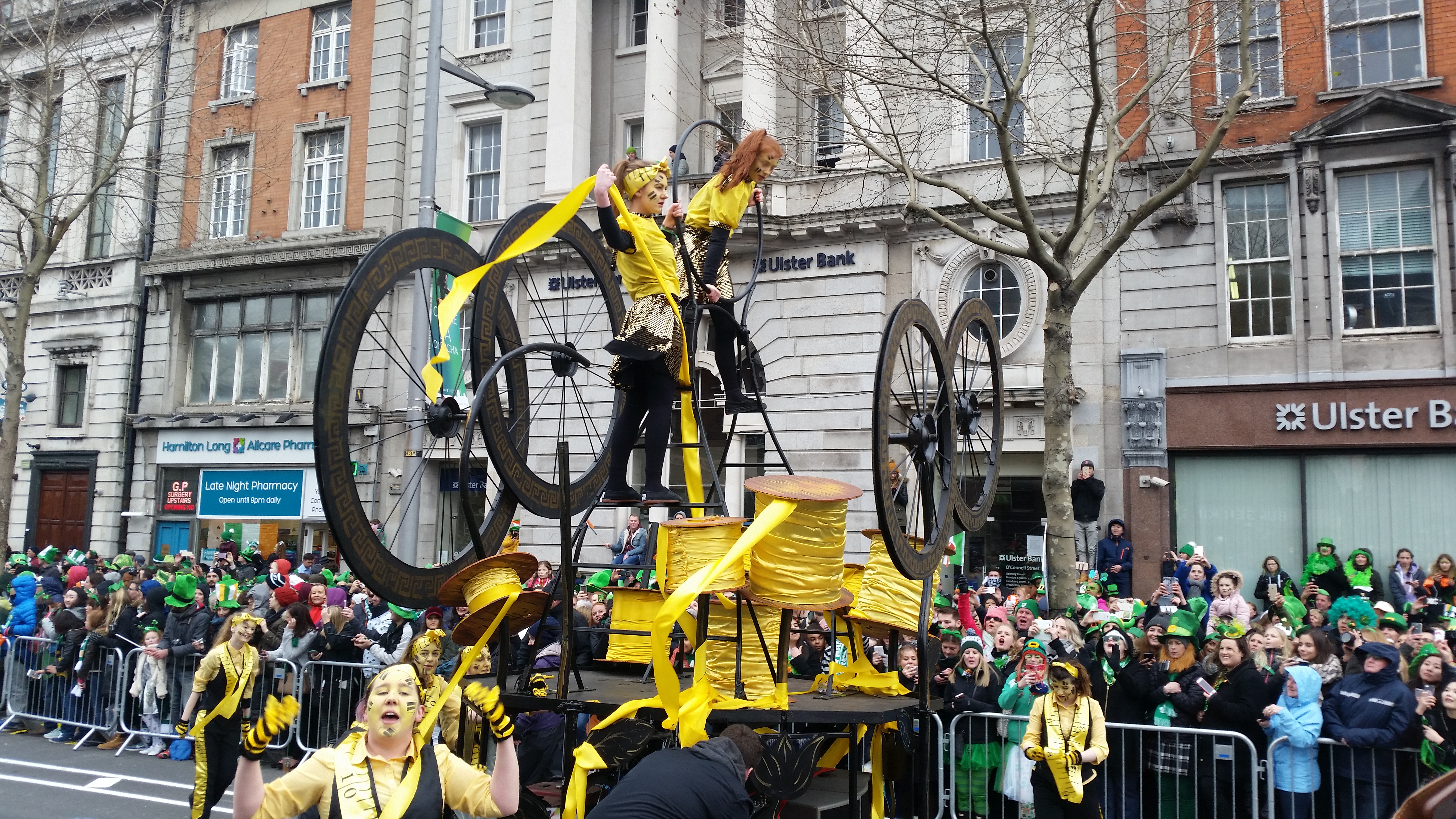 Zanim zdecydowaliśmy sie przyjechać do Irlandii, dużo czytaliśmy i szperaliśmy w internecie na jej temat. Wyobrażałam sobie genialna paradę, wielkie uliczne show, przynajmniej na skale Fallas w Walencji (link). Stąd podekscytowanie i radość. Byłam pewna, że kolorowy korowód będzie śnił mi się po nocach, a całość przyćmi Chiński Nowy Rok świętowany w Londynie, a moze nawet karnawał w Wenencji? Rzeczywistosc jest jednak bardziej prozaiczna. 17 marca to w Irlandii dzień wolny. Irlandczycy w większości zostają w domach i oglądają paradę w telewizji, bądź uczestniczą w tej organizowanej w ich miastach, od po południa zasiadają w pubach i świętują z bliskimi. Młodzież jedzie do Dublina, lecz nie na paradę a by zająć jak najwcześniej miejsce w pubach na Tample Bar. Które zaraz po skończeniu występów będą przepełnione aż po brzegi. Dla kogo więc ta parada? W większości dla turystów, którzy ściągają tłumnie do miasta, ubierają się w zielone boa, kapelusze troli i rude brody i obserwują paradę.