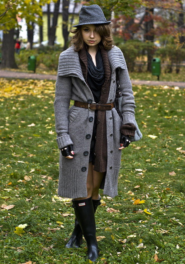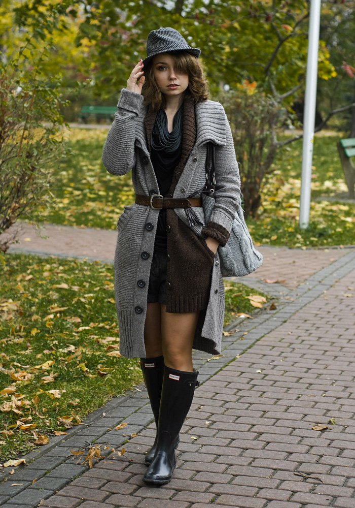 HUNTER: wellingtons, H&M: szary sweter, brązowy sweter, bluzka, kapelusz, szorty ; no name: naszyjnik, , BERSHKA: cienki szary sweter, HOUSE: bag